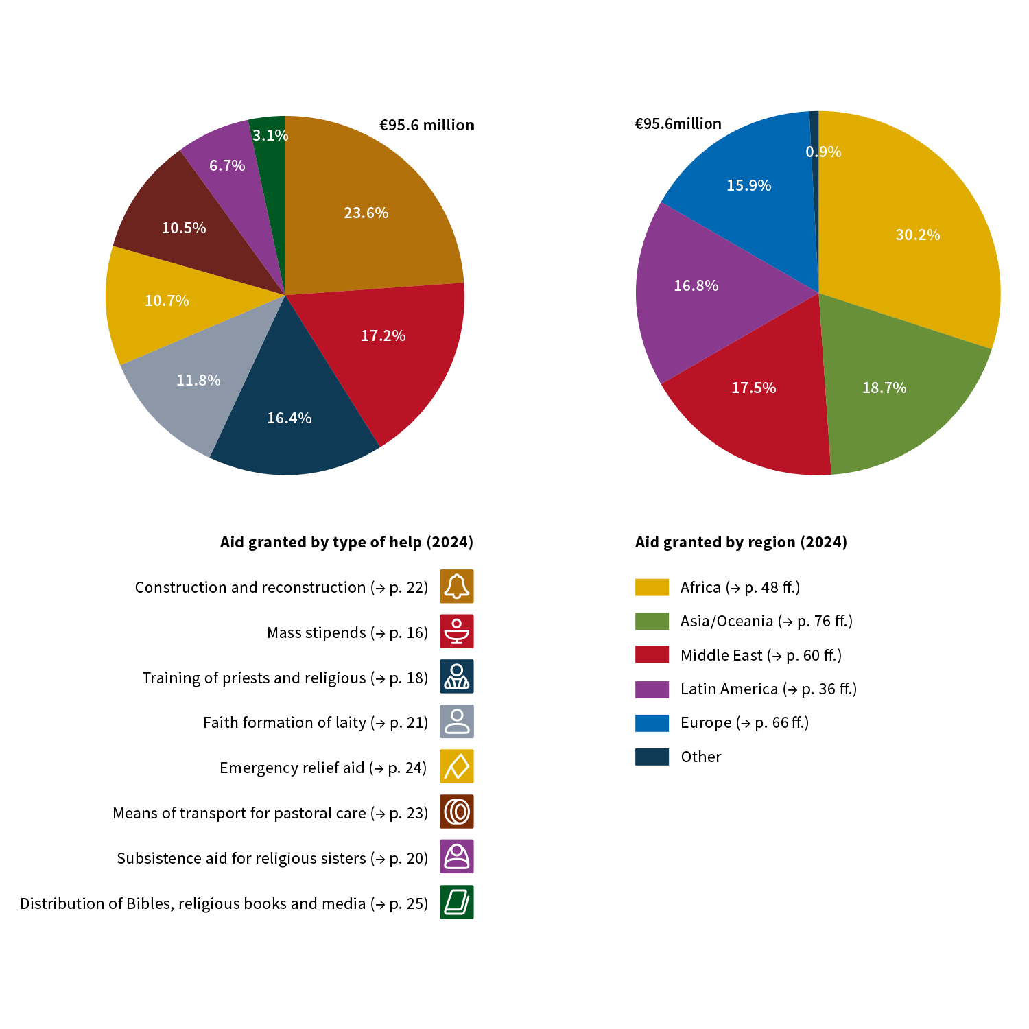 As always, the proportion of necessary expenditures for administration and fundraising was comparatively low, so that as many funds as possible could reach local Christians. In 2024, we supported a total of 5,335 projects in 137 countries with approximately 95.6 million euros. 17.3 million euros were used for proclamation of the faith, information work and advocacy for disadvantaged and persecuted Christians worldwide.