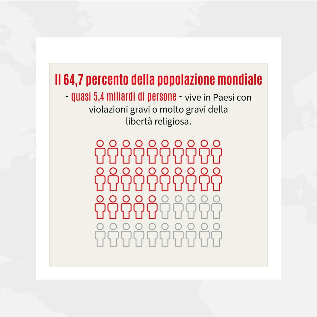 Secondo il Rapporto sulla Libertà Religiosa nel Mondo 2025 pubblicato da Aiuto alla Chiesa che Soffre, circa 5,4 miliardi di persone — quasi due terzi dell’umanità — vivono in 62 Paesi in cui si registrano forme sistematiche di persecuzione, oppressione o discriminazione, perpetrate da autorità statali e/o da attori non statali.